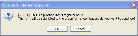 6) Upon final submission, a concluding alert will again remind the user that this is a practice registration.