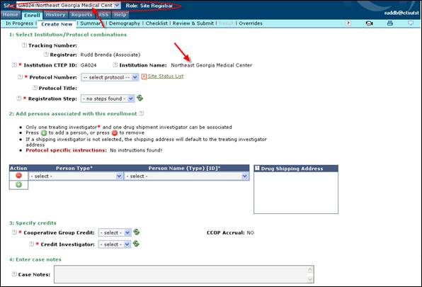 3. Update the displayed information as necessary. All sections of the “Create New” screen can be updated after the registration is initiated except for section 1 (Select Institution/Protocol combinations).