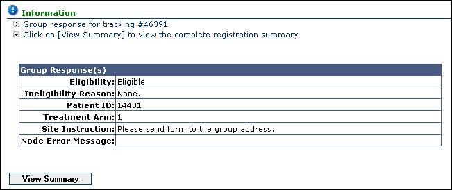 Communicates Group registration output data such as treatment assignment, patient ID, and registration notes back to the OPEN portal user.