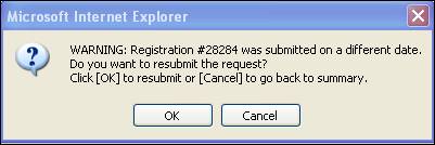 5. Upon final submission, a concluding alert will again remind the user that this is a practice registration.